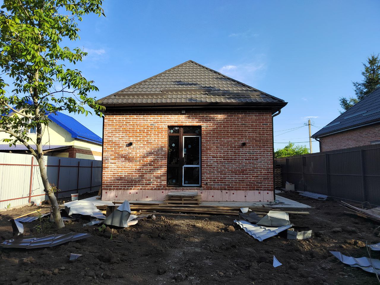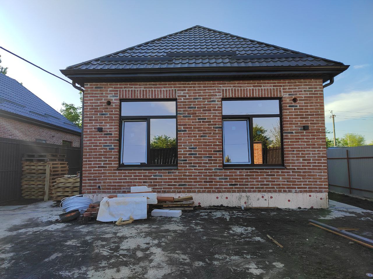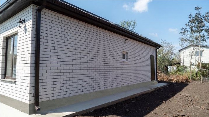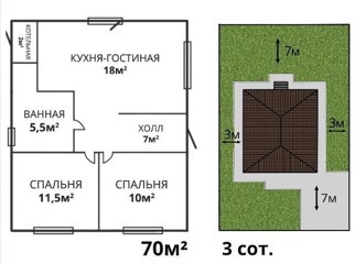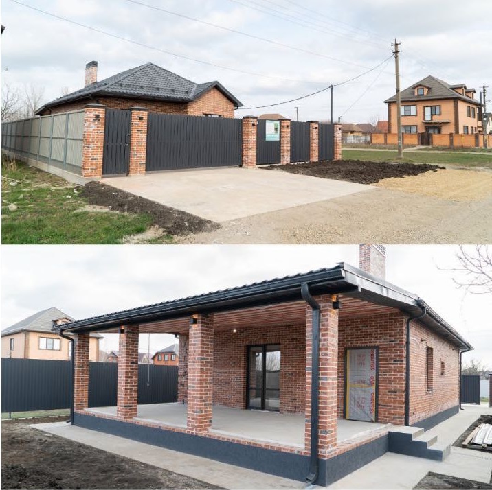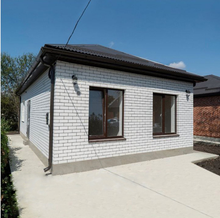Проект дома рассчитан для комфортного проживания 2-4 человека Площадь общая ...................70 кв м Спален ..................................2 Материал стен.......................газоблок+кирпич Фундамент ............................ленточный Забор.....................................по периметру из металлопрофиля, ворота откатные Коммуникации ......................электричество, центральная водопровод Отопление.............................электро- или газовый котел
