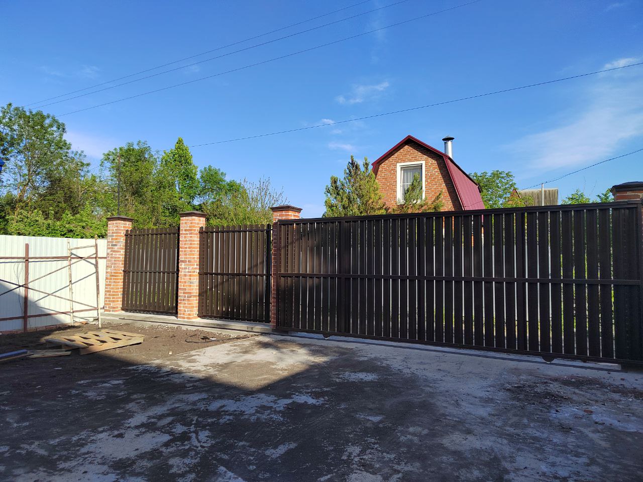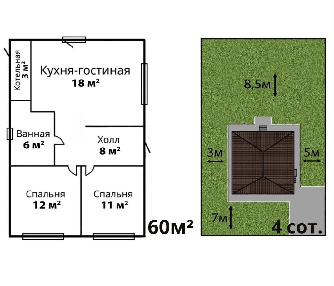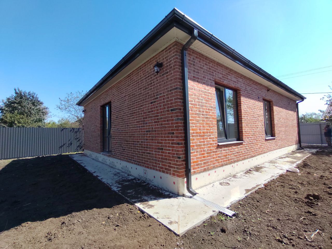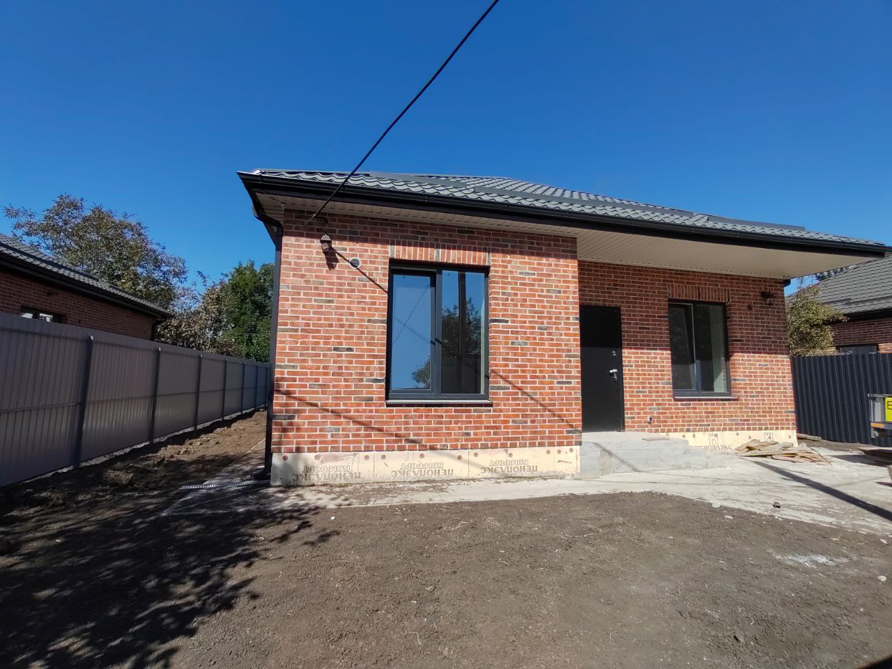 Проект дома рассчитан для комфортного проживания 3-5 человек Площадь общая ...................60 кв м Спален ..................................2 Материал стен.......................газоблок+кирпич Фундамент ............................ленточный Забор.....................................по периметру из металлопрофиля, ворота откатные Коммуникации ......................электричество, центральная водопровод Отопление.............................электро- или газовый котел